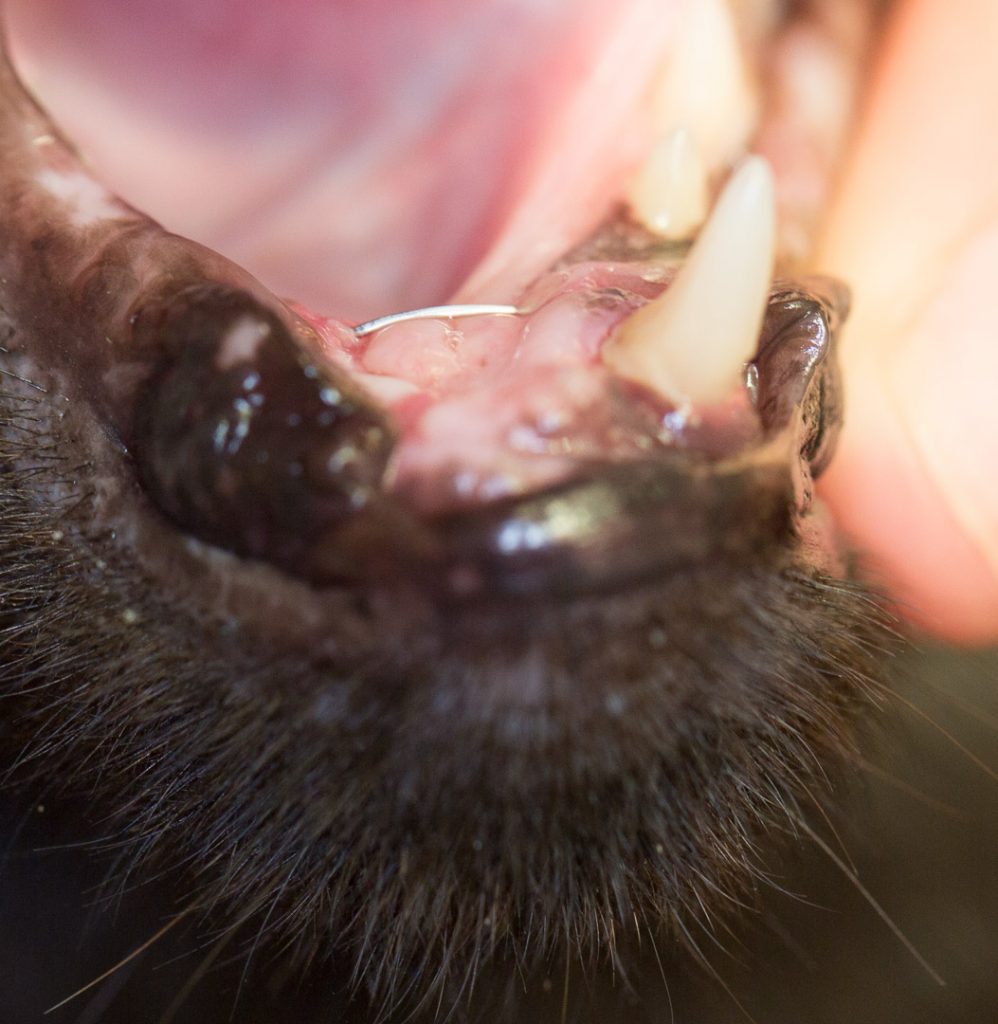 The broken jaw in this cat has been repaired using wires. It will take many more weeks for it to heal and be able to use its jaw to chew, so a feeding tube is needed.