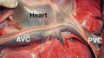 On the far right is the diaphragm (D), the muscle of respiration. It separates the thorax to the left of the diaphragm, from the abdomen on the right (the liver and stomach are just behind the diaphragm). The posterior vena cava (PVC) is visible as the horizontal blue structure at the bottom of the picture that is coming through the diaphragm. It is large because it has the job of returning almost all of the blood from the back end of the body to the heart.