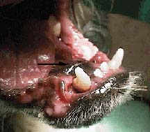 This jaw had to be wired back together after the teeth were cleaned. It will also need to be on long term antibiotics. Unfortunately, the problem might get worse as time goes on. The wire (marked by the arrow) can be visualized just to the right of the tongue at the very center of the picture. It is wrapped all the way around the jaw and anchored under the chin. It will need to stay in place at least one month.