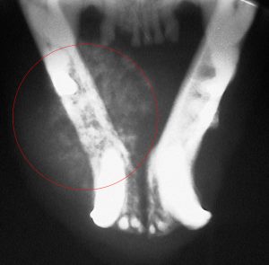 A cancer called Squamous Cell Carcinoma can erode the jaw and cause a spontaneous fracture