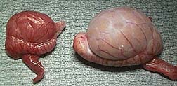 You can easily see the difference in size between the atrophied testicle in the abdomen (left) and the normal testicle from the scrotum on the right. The testicle in the abdomen was removed at a young age so it never had a chance to become cancerous.
