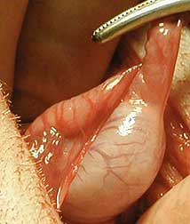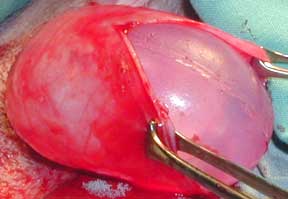 Notice the lack of bleeding from the skin as we enlarge the incision for room to remove the testicle. The white structure in the center is the testicle covered with protective tissue.