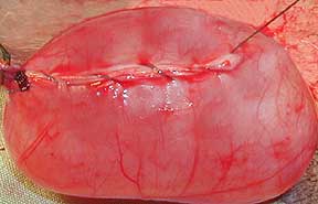 In this picture the testicle has been brought out through the inch incision in the abdomen