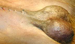 This is the appearance of a different dog that had a cancerous testicle, called a seminoma. It was not removed until later in life, so it had a chance to enlarge tremendously.