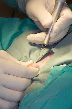 Once our surgeon has scrubbed up and is in a sterile gown, gloves, and mask, the surgery begins
