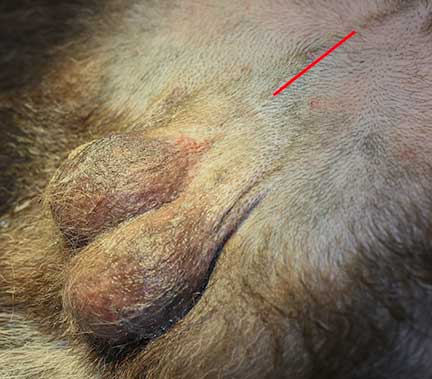 This is the appearance of a normal dog scrotum prior to neuter surgery. Use it as a basis of comparison at the end of this section to see what the scrotum looks like when we have implanted neuticles in place of the testicles.