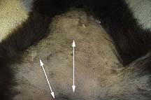 The white arrow shows the area of the hernia on the inside of the right rear leg. This is called the inguinal area. It is difficult to visualize the swelling from this view.