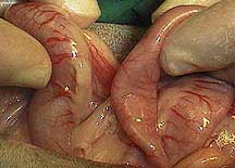Here is a different case showing the bruising and compromised blood supply that can occur when the intestines are trapped