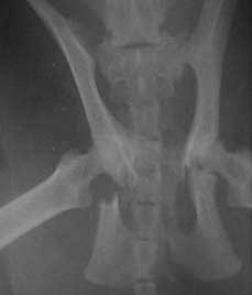 This is a radiograph of cat with a fractured pelvis that is more severe than the one Sundance has. Do you see the fracture on both sides?
