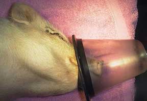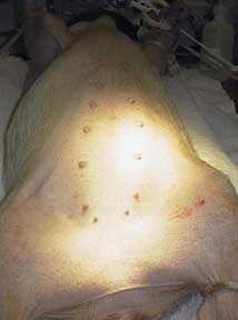 Pigs need to be monitored carefully for overheating during anesthesia, which is the opposite of most anesthetized animals. They produce more body heat relative to other animals because of their large muscle mass. Pigs do not sweat or pant, they need to be in contact with something cool to rid of excess body heat. Because of this we constantly monitor their temperature during and after the surgery.