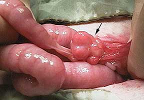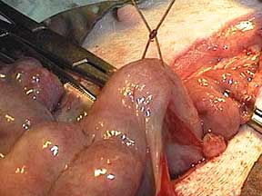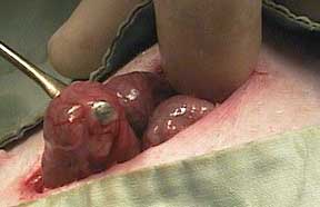 The uterine horn is traced into the body cavity until the ovary is found. It has to be gently teased from its location near the kidneys in order to be able to pull it out through the abdominal incision. In older pigs this part of the procedure is much more difficult.