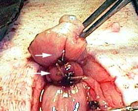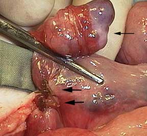 The blood supply to the ovary is extensive, so a special technique is utilized to prevent hemorrhage. This technique involves the use of special clamps. The smaller arrow on the top points to the ovary, which will be removed along with the clamp. The 2 larger arrows on the bottom point to two sutures used to tie off (called ligation) the blood supply to the ovary.