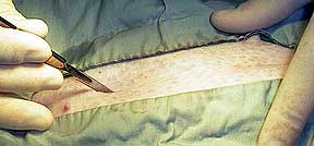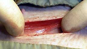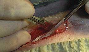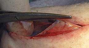 In this picture the linea is being held up with a forceps, and a scalpel blade (held upside down) is being used to make the incision.