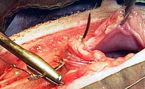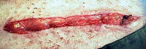 The surgeon makes an incision near the umbilicus and extends it 3-5 inches in the direction of the tail (the tail is at the left in this picture). We try to make our incisions as small as possible to minimize anesthetic time, decrease post operative discomfort, and minimize the healing time.